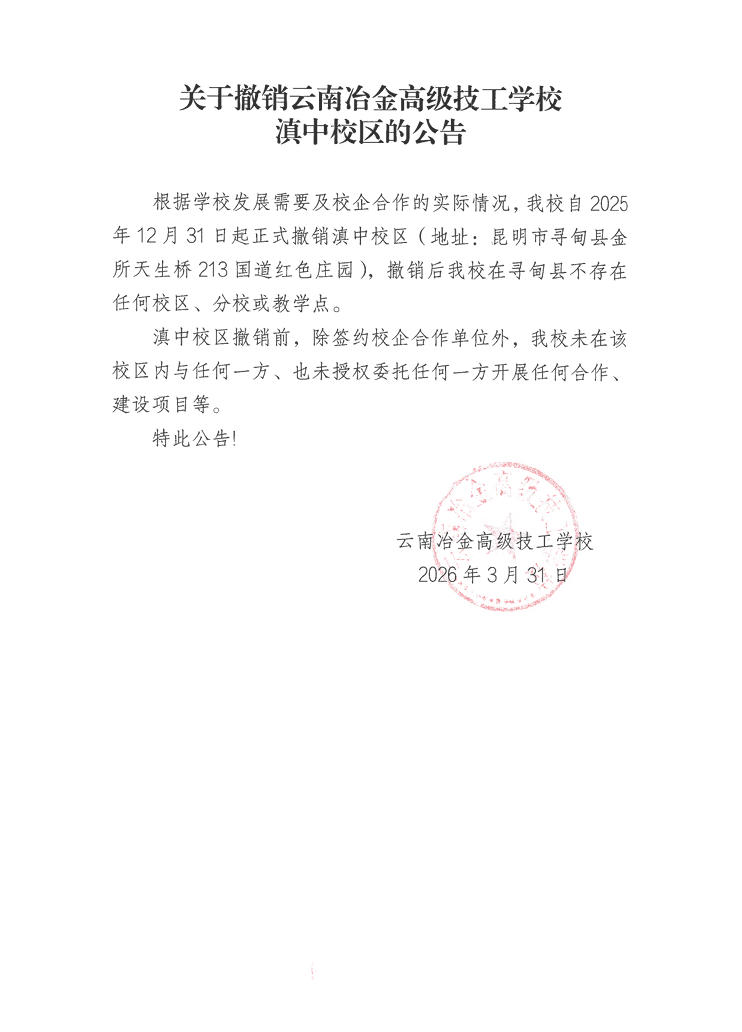 关于撤销云南冶金高级技工学校滇中校区的公告